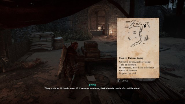 The Pruvinis treasure map can be found on a desk near the fort’s ruined tower. Eivor will say that the Ulfberht Sword is valuable and you need to find it.