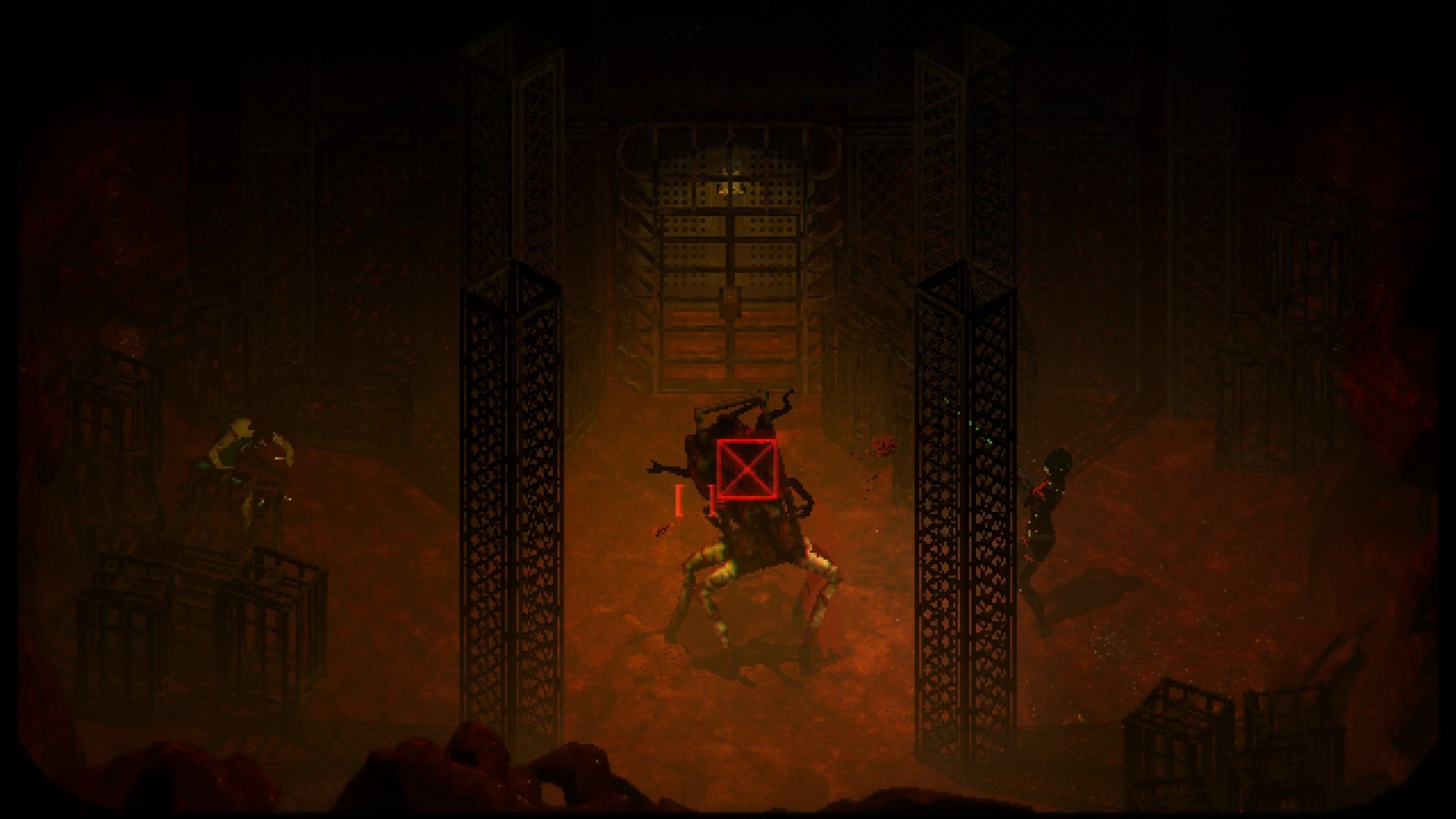 Anyway, go ahead and jump down the pit and prepare for battle. You’ll be up against a miniboss which I’ve dubbed as Mr. Cagehead. Avoid its lunging attacks, and shoot it.