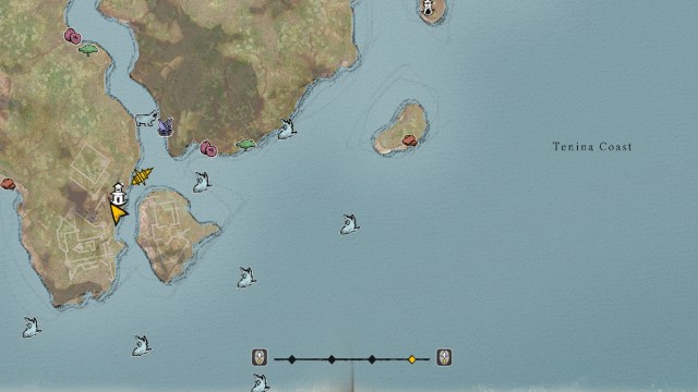 You’ll be told that the relic is in Fort Louis in Tenina Coast in the Red Isle. If you open the map up and look south, you’ll find Tenina Coast, and Fort Louis will appear as an undiscovered location. Charter a course and head down.