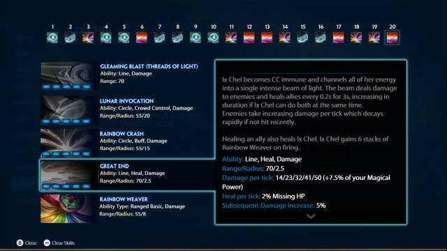 If Ix Chel becomes a factor immediately, she’ll enjoy a smoother ascent to power. Set up her skills so she begins by improving Gleaming Blast at low levels. Rainbow Crush is your secondary priority in the early going. Don’t entirely ignore Lunar Invocation and her Great End move, however. Her Rainbow Weaver isn’t usually a factor.