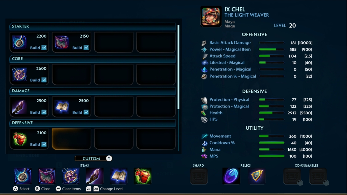 Ix Chel hits hard from a distance with powerful ranged abilities. Focus on reducing her cooldown times so she can hit more frequently. She’s also a decent healer. It’s a good plan to augment both of those capabilities.