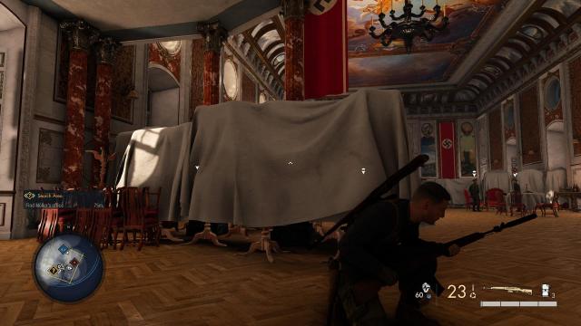 - Cause a distraction that would make soldiers investigate (i.e., throw a bottle or have your character get slightly spotted). Once Kummler moves to the center of the room, shoot the chandelier’s winch to cause it to fall.