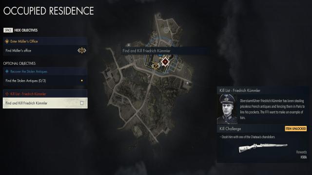 Doing these actions will complete the Friedrich Kummler Occupied Residence Kill List task in Sniper Elite 5. You’ll receive the K98k (Karabiner 98) for your efforts.