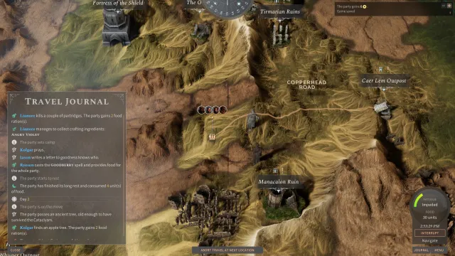 After leaving Caer Cyflen (or any destination), you’ll see Solasta: Crown of the Magister‘s world map. If you click on a destination, you’ll be able to travel there. You’ll also notice various settings in the fast travel panel as well as those in the game settings menu. These options involve speeding up the process, removing random encounters, stopping the action when something has been crafted, and so on.