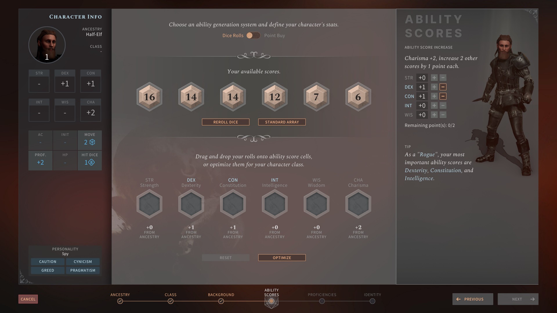 Lastly, do take note of the stats/attributes such as strength, dexterity, constitution, and the like. The game will even inform you which stats are best for a certain class. You can either use dice rolls or manually assign points. There’s even a small box that you can tick if you wish to max out the entire stat line.