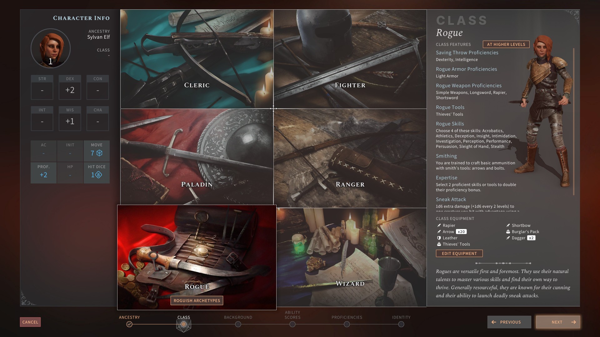 Moving on, let’s talk about class picks. This screen shows you additional bonuses, skills, and proficiencies that each class has. This is also where you can change a character’s starting weapon loadout. Let’s pretend that we picked a Rogue.