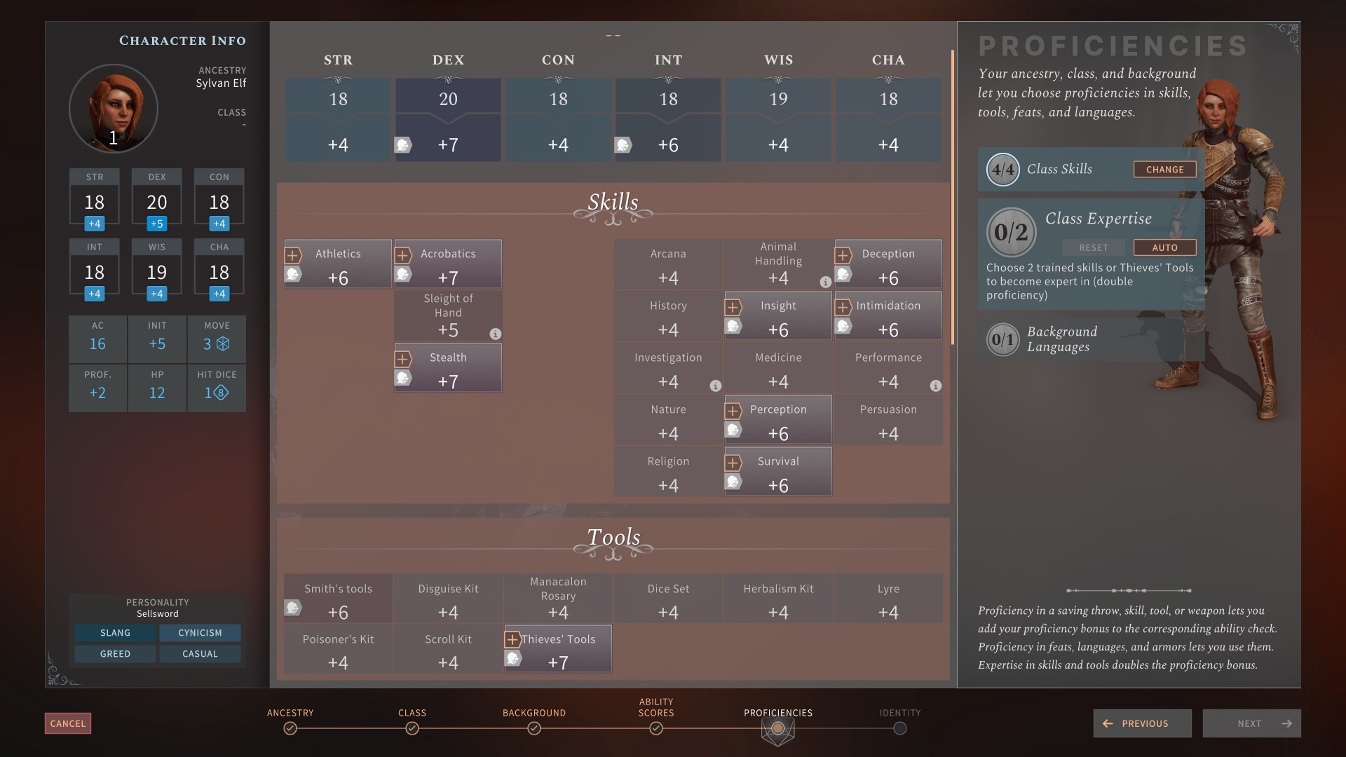 Since we’re talking about dialogues already, take a look at the bottom of the screen to see the languages. Some are already unlocked based on race, whereas others can still be selected here. Likewise, don’t forget proficiencies in certain utility items such as Smith’s Tools and Poisoner’s Kit (crafting) and Thieves’ Tools (opening locks).