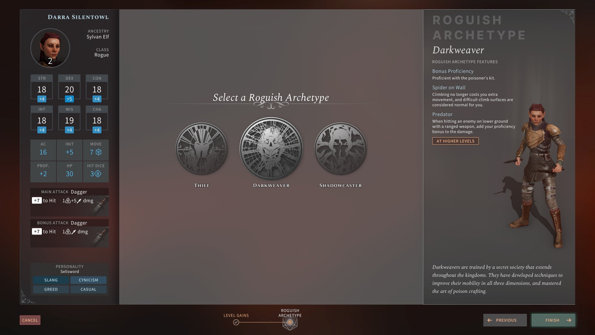Note: If you’re just creating a new character, you can click on the “At Higher Levels” button when selecting a class. It’d show you the perks and features that get unlocked as you level up. After you’ve finished character creation, you can also select a character and click “level up” to see the selections presented to you as you progress. This is mostly to keep you informed (i.e., seeing the subclasses and feats). Just try it on a dummy character since the main campaign in Solasta: Crown of the Magister won’t actually let you start with characters that have been pre-leveled.