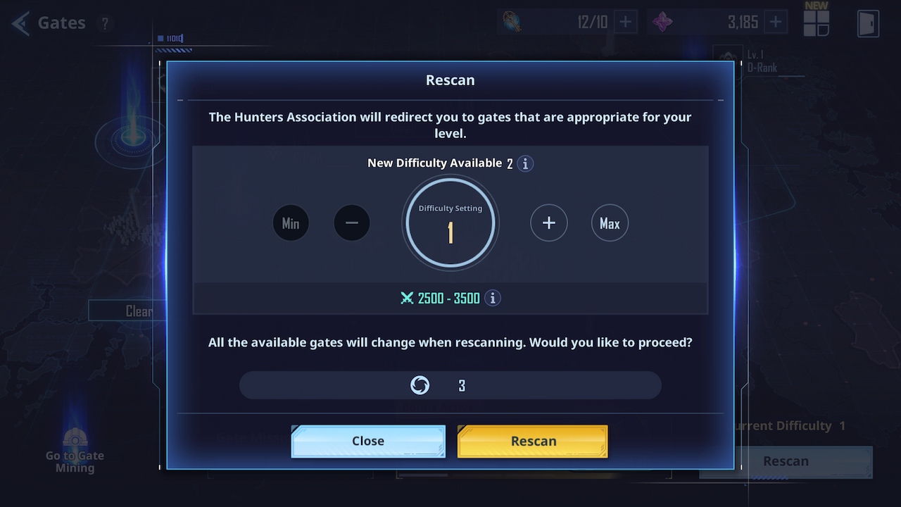 Gates also provide a ton of XP compared to other activities in Solo Leveling: Arise. Unfortunately, the one thing they don’t provide are Essence Stones. While you only start with Normal Gates, you’ll eventually be able to upgrade to Difficulty 5 or higher by selecting the “Rescan” button.