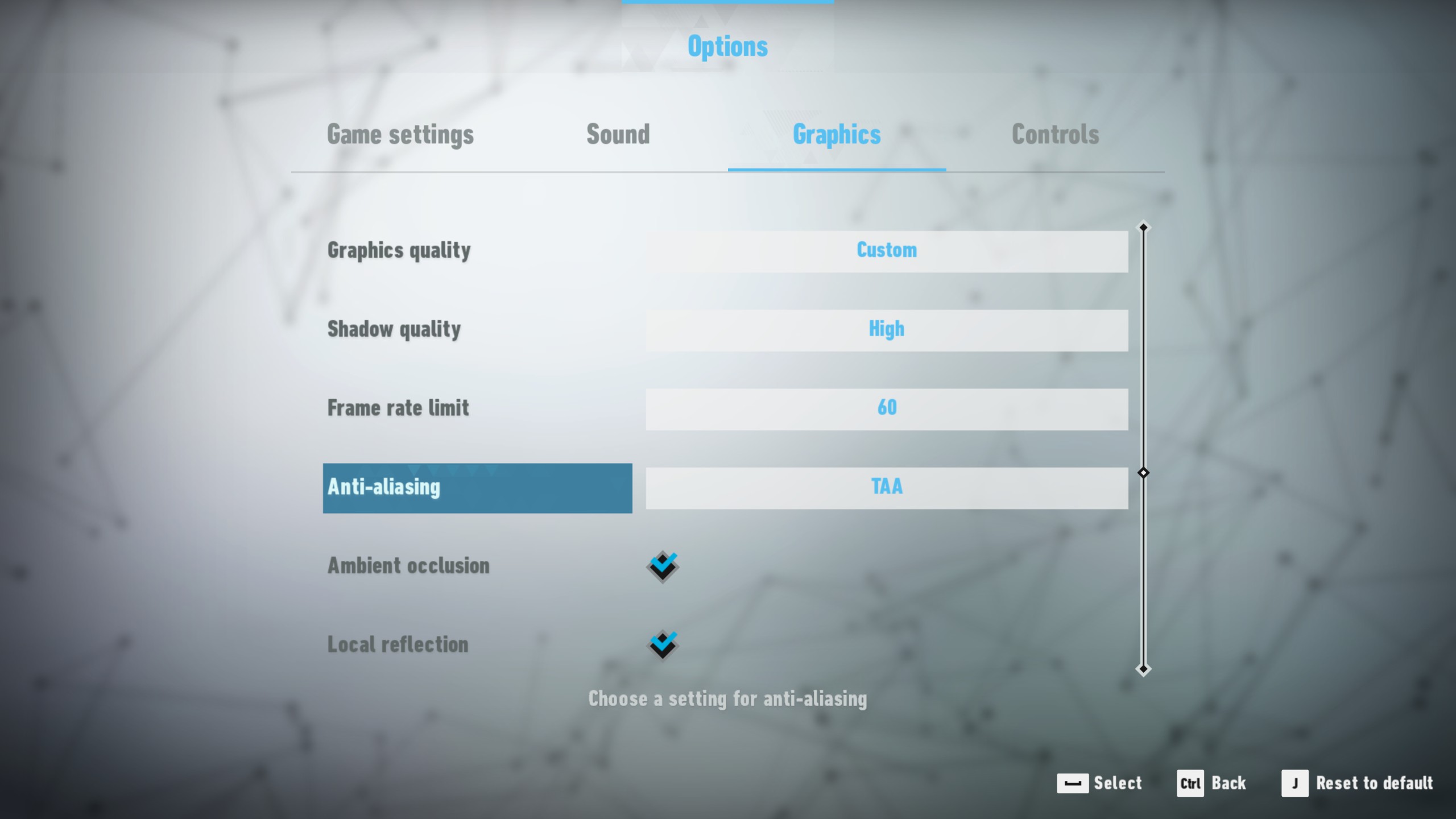 Most settings, including shadow quality, go from lowest to medium to high. The frame rate limit can only be set to 30 or 60, despite higher framerates seemingly not breaking any of the game’s logic. You can also turn ambient occlusion and local reflections on or off. Anti-aliasing can be set to TAA or FXAA depending on what sort of blurriness you’re into, if any.