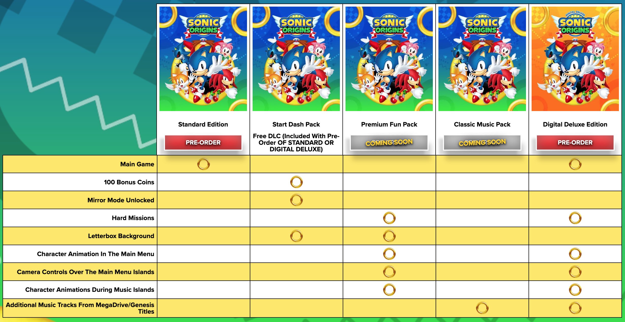 The standard package asks for $39.99 USD. Some of Sonic Origins‘ most attractive features, such as animated content and additional modes, seem to be found in premium tiers and DLC. The Standard Edition includes the main game. A Start Dash Pack offers 100 bonus “coins,” a Mirror Mode, and a Letterbox Background for free as a pre-order bonus. The Premium Fun Pack contains the Letterbox Background, character animations, a hard mode, camera controls over the main menu islands, but not the game. There’s also a $44.99 USD Digital Deluxe Edition, which contains the game and Premium Pack content, but not the pre-order bonus or the Letterbox Background. An additional Classic Music Pack is separate, and includes extra tracks from the Genesis versions for $3.99 USD.