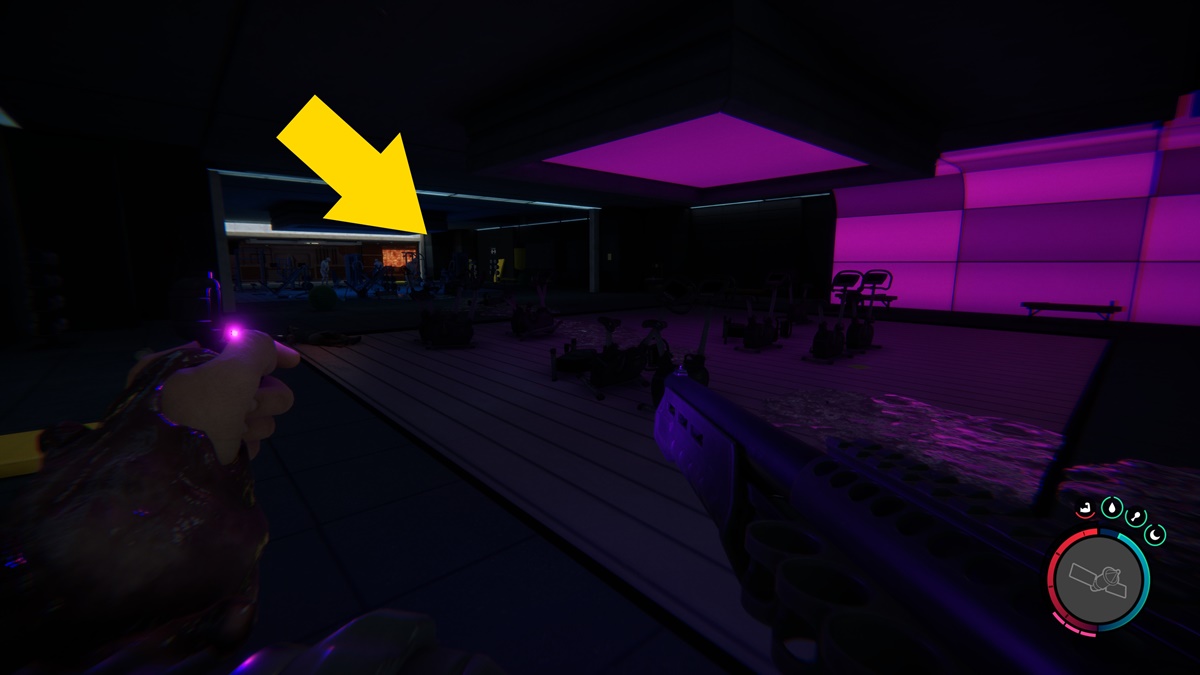 The locked door is at the end of the opposite hallway and, once opened, you’ll find yourself in a gym. There are a few mutants here, but you won’t need to worry too much. What you do need to look for is the weightlifting room with blue lights. There, you’ll see a barbell bench to your right. The Sons of the Forest Track Suit can be found on the bench (seen in the image below).