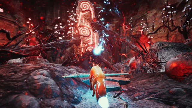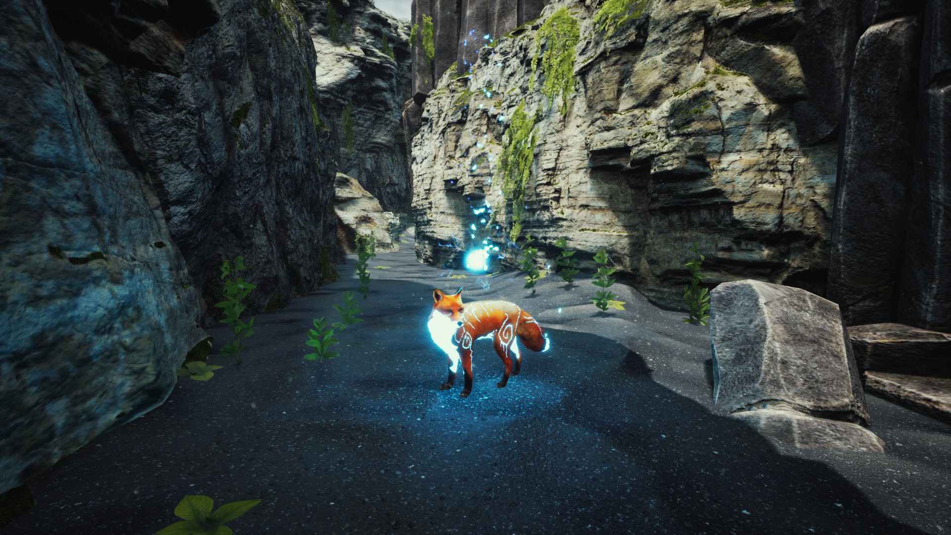 Spirit of the North starts fairly weakly and mostly just has the fox walking forward through linear environments before meeting the spirit fox. Shortly after, a series of events unfolds where the fox gets enlisted in the fight against corruption and gains the ability to absorb spirit power from flowers and statues. The fox only needs to walk above a glowing blue flower and bark, and the flower’s energy will course through it and cover its body with runes. In the beginning, the fox can only run and jump, though.