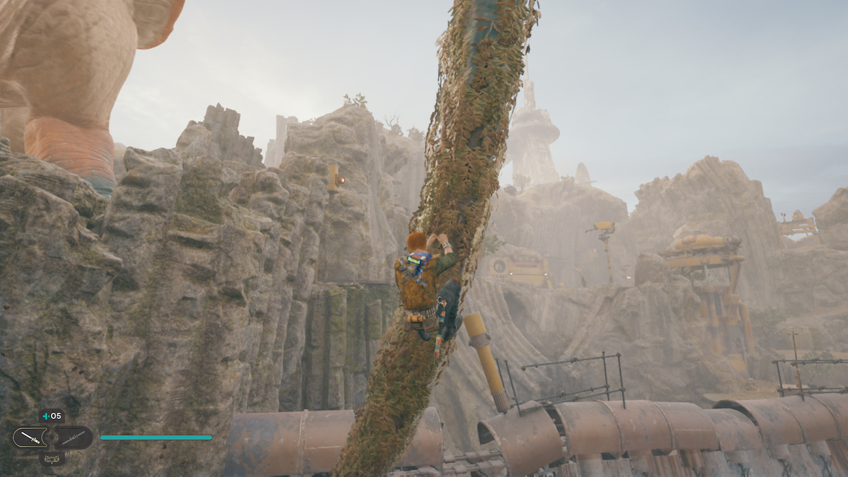 Once you reach the creature, focus on it ( Xbox RB, PC CTRL, PS5 R1) it’ll be highlighted green. Focusing will bring down the creature to you. Jump on the tusk that has vines on it, and the creature will move to the other side. Jump off at the other side, and make your way down the path.