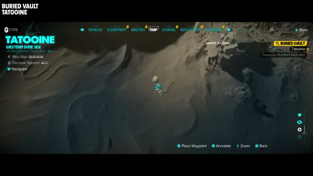This is a very simple vault due to the openness of the desert. Simply head southwest through the desert, and you will eventually come to the buried vault in the sand. Use the holodisk to open up a hatch; you must blast it with an ion blaster. Head through the newly opened door to receive your loot, including Jet Kordo’s Legacy Part 5, the Scoundrel Jacket, and the X-FP-C28 Ship Computer.