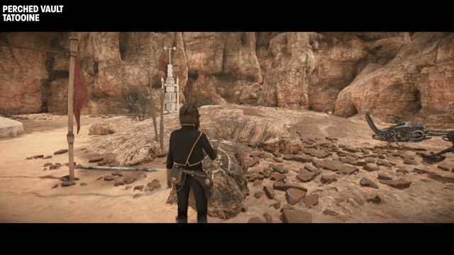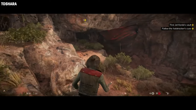 In this pit, you will find an overhanging rock leading to a cave. On the left of the entrance to the cave, you will find a spot to enter the Holotracker. Interacting with this will drop down a ladder in front of you. This is the entrance to the first of the Jet Kordo’s Legacy vaults in Star Wars Outlaws.