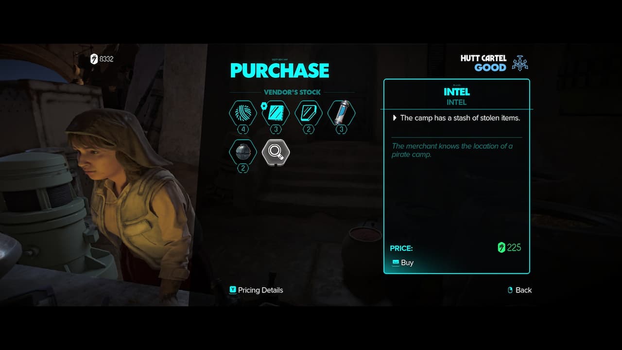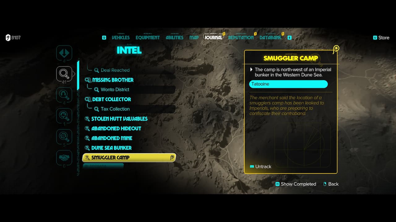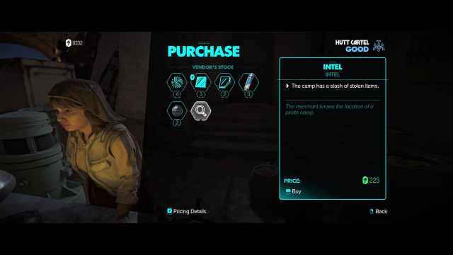 Along with some materials and items, you can purchase some intel with the location of a pirate camp for 225 Credits. Upon receiving the intel and leaving the menu, you get the Smuggler Camp intel questline in your journal.