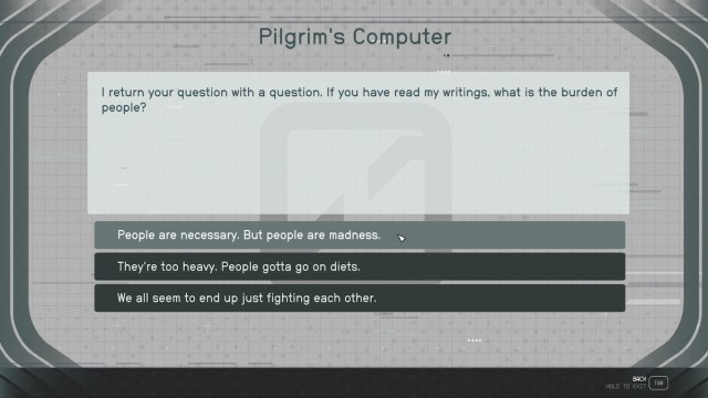 You’ll eventually find a building with a locked door and a computer. Open up the computer, and it’ll start to quiz you. Although all these answers are in the Pilgrim’s Writings, they’re scattered across the Outpost, making it difficult to track down.