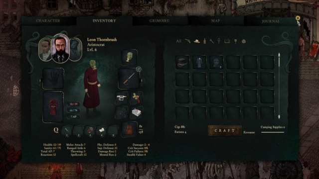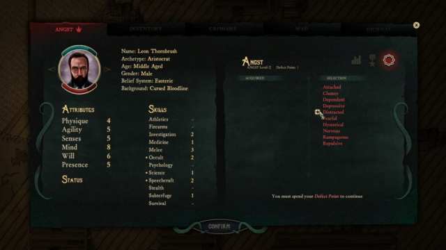 You start the game by creating your character. Stygian: Reign of the Old Ones might be set in the unenlightened era of the 1920s, but all Archetypes (classes) are available to women as well as men (though you can expect some differences in reactions when you get to encounter people). Each Archetype has 4 backgrounds (subclasses), 3 of which give you a boon in exchange for a certain penalty. For example, a Marine (Soldier sub-class) can start with the “Aimed Shot” ability. However, they also start out with some accumulated Angst to represent the horrors of war witnessed before the events of the game. You also chose your morality system. Acting in tune with it helps you regain sanity. So, for example, Exoterists fare better if they see the occult behind everything. Afterward, it’s just a simple matter of spending points on Skills and Attributes.