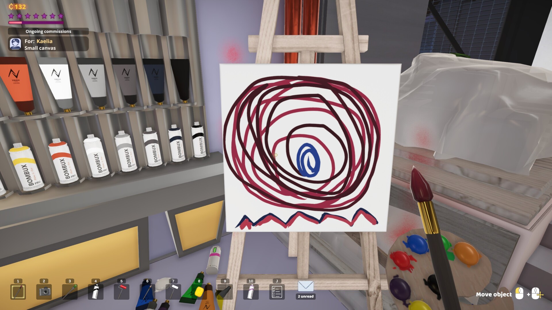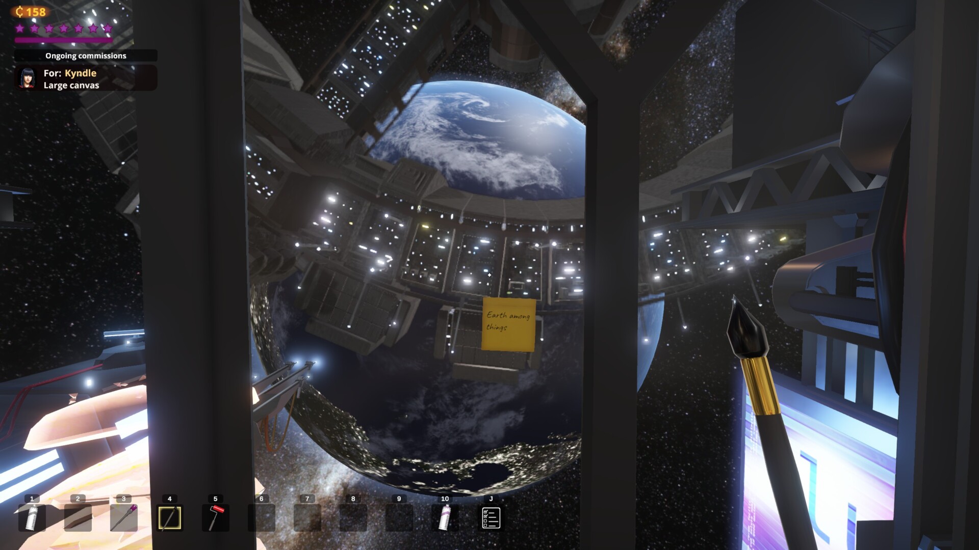 SuchArt takes place in the future where the Earth has been invaded by an alien species of crab creatures. Are they dangerous? I’m not actually sure! For whatever reason, though, you’re on a space station. The game begins when you move into your new space studio and are immediately set to work. Your goal is to accept commissions and turn them in, sell paintings on the marketplace, make money, and increase your fame along the way. The game presents you with a series of quests in your journal, such as fulfilling commissions, selling a certain amount, or just completing a variety of tasks. It’s all easy to understand and quite focused.