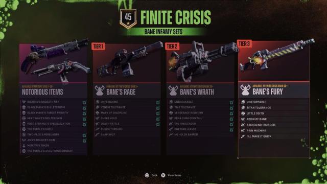 The higher your Finite Crisis rank, the better gear you can get. At Finite Crisis rank 1-29, you can get Tier 1 Bane Infamy weapons and gear. At Finite Crisis rank 30-59, you get access to Tier 2. At Finite Crisis rank 60+, you get access to Tier 3. It’s fun to chase these Infamy sets because they are the best in the game and are necessary to make the best builds.