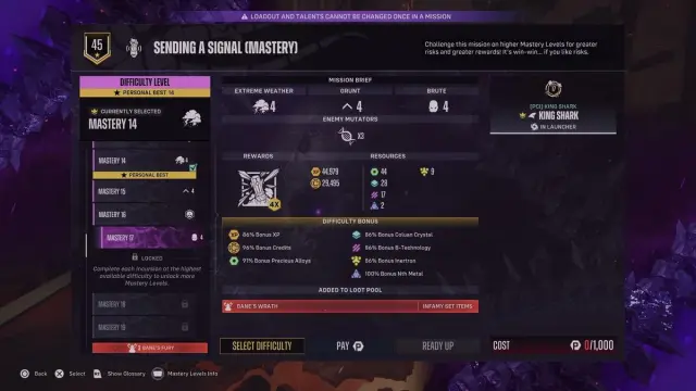 Once you’re ready to play an Incursion, you need to select a Mastery Level. The higher the level, the more XP, resources, and gear you’ll get. It’s important to note that you need to play all three Incursions to continue raising your Mastery Level. Play all three of them equally on the highest Mastery Level available to keep that Mastery Level on the rise.