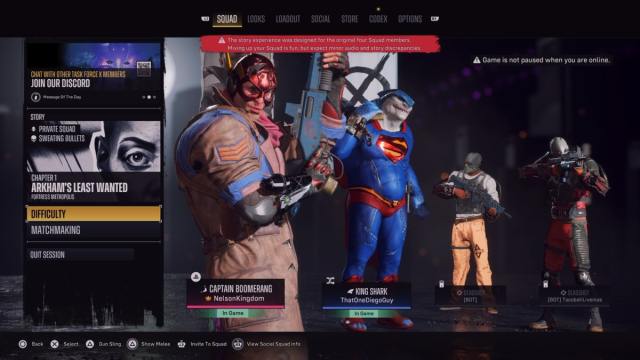 If you want to play co-op in Suicide Squad: Kill the Justice League, you can by going to the Squad menu and clicking L3 on the controller. Keyboard and mouse players will find their input on the bottom of the screen next to the Invite to Squad prompt.