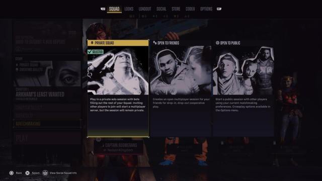 While you can play Suicide Squad: Kill the Justice League solo, you have to play online. The matchmaking options are Private to Squad, Open to Friends, and Open to Public.