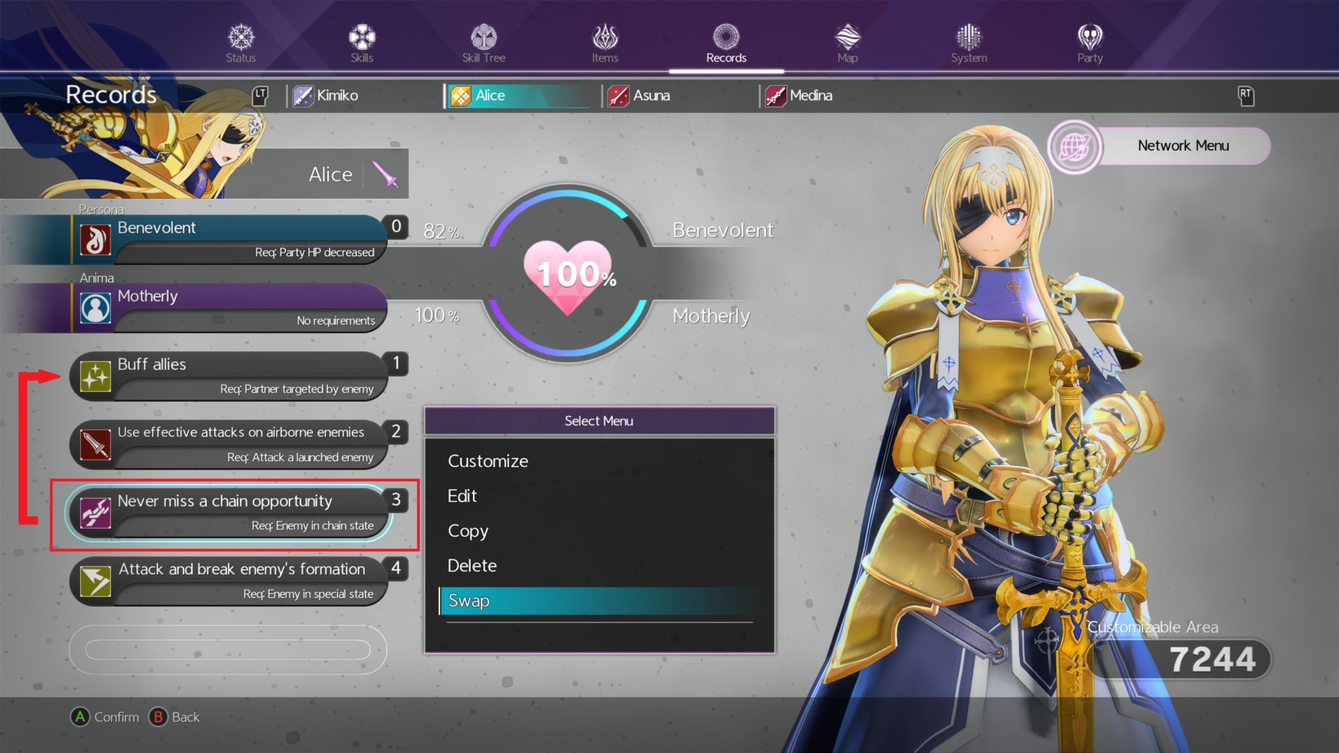 One of these is tactics is “Never miss a chain opportunity.” Select that and hit the left trigger button (LS) to assign that tactic. This will allow a character to use a sword skill and open up a chain burst opportunity when possible.