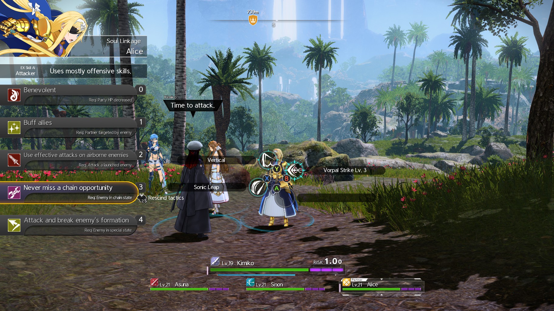 This one is more complicated once you have multiple characters in your party, but it’s a fairly effective method to boot. The idea is to open up with Kirito’s sword skill, then, immediately hold the left shoulder button (LB) to open the Soul Linkage panel. This will show you the sword skills equipped by one of your characters. Hit the button for that sword skill so they can cast it.
