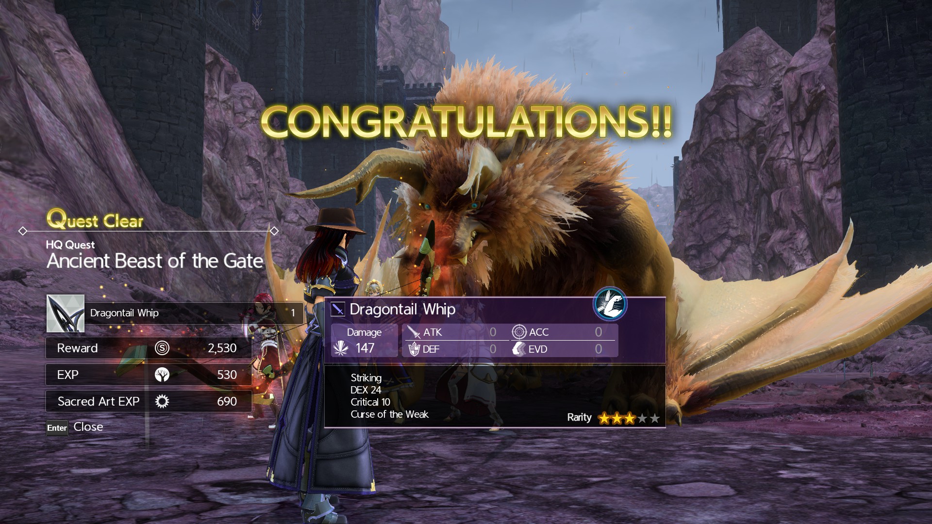 Eliminating this Divine Beast nets you the Dragontail Whip. It’s got +147 damage, +24 DEX, +10 critical, and “Curse of the Weak.” This perk debuffs an enemy with -7 attack level and -1 defense level.