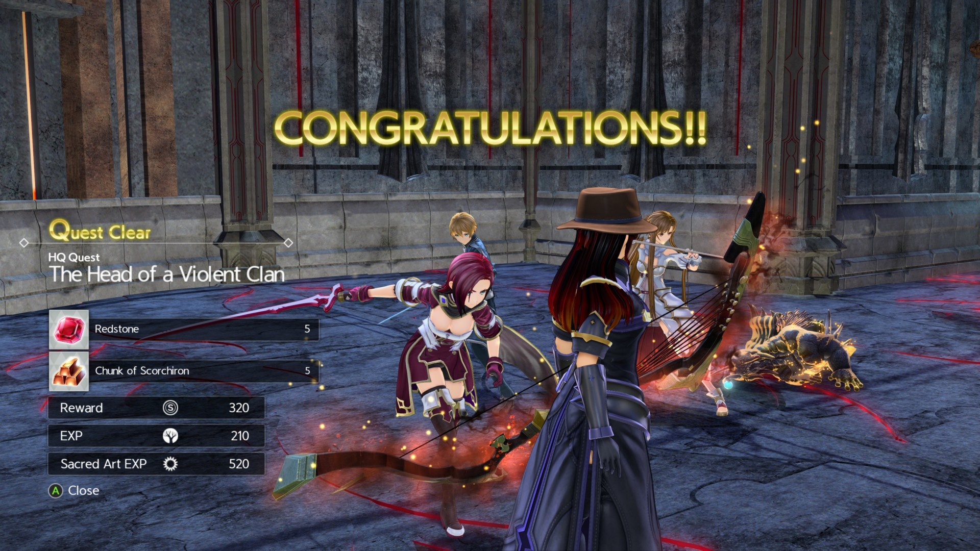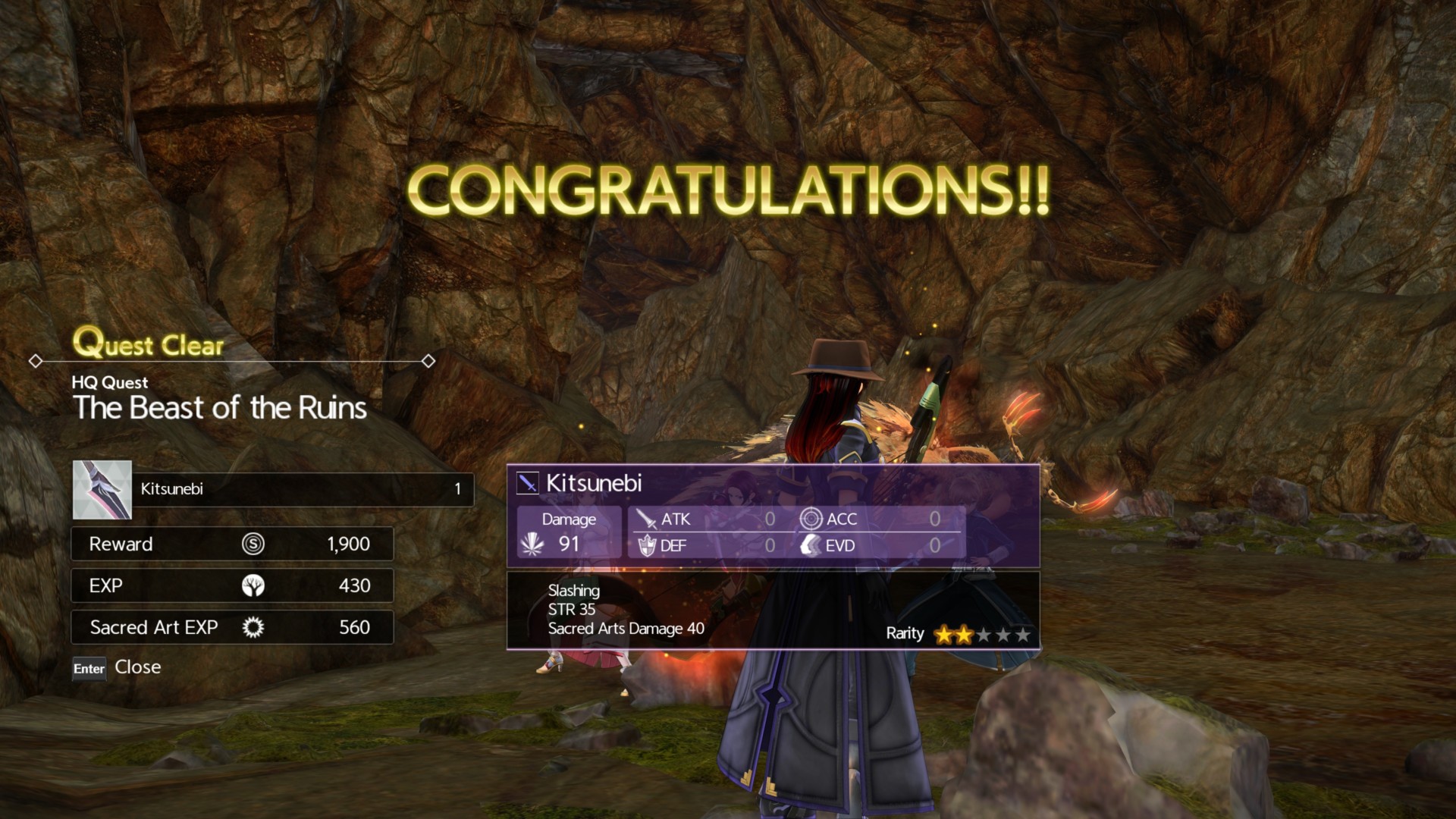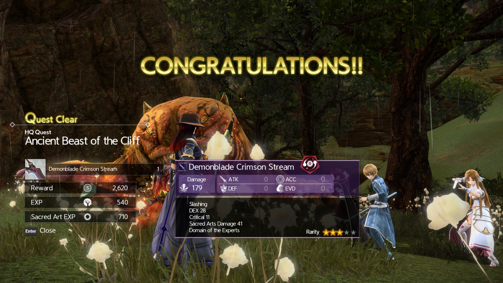 Defeating this Divine Beast nets you the Demonblade Crimson Stream. This 2H sword has +179 damage, +28 DEX, +11 critical, +41 Sacred Arts damage, and the “Domain of the Experts” perk (+1 skill connect count).