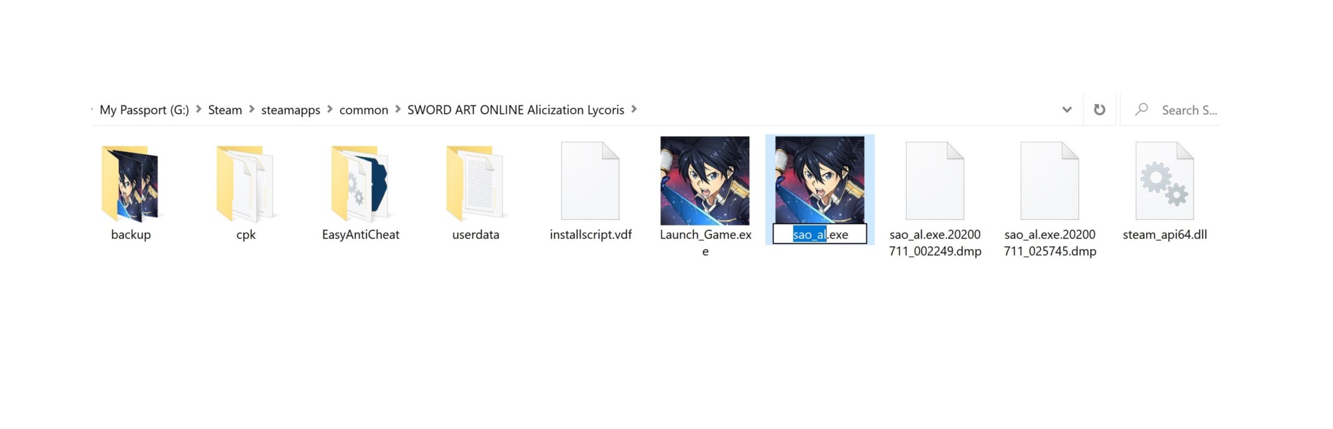 Go back to the main folder and create a backup folder too. Then, create copies of both “Launch_game.exe” and “Sao_al.exe” and place the copies in the backup folder.