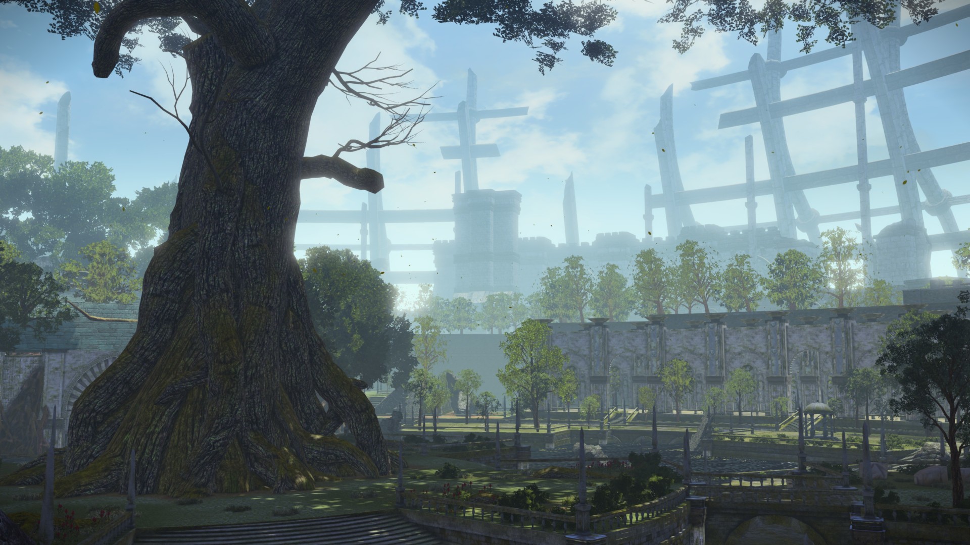 First, head to the right and go around the giant tree. You’ll spot this area which I’ll call the “statue bridge.”
