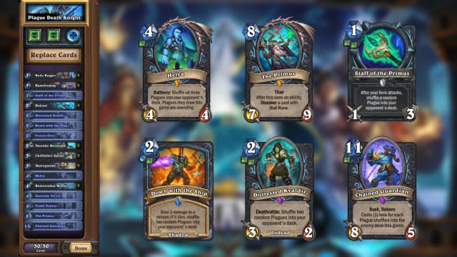 For a deck that expects to go long we run a fairly low curve, but The Primus, the new Death Knight Titan card, is our one concession to heavy late-game value. It offers hard removal, board presence, or mana cheating, in addition to card advantage via Discover, making it a great play at any point in the game. The overall strategy here is to stay low, control the board, shuffle in Plagues when you can, and play Helya as early as possible to start racking up that Plague damage.
