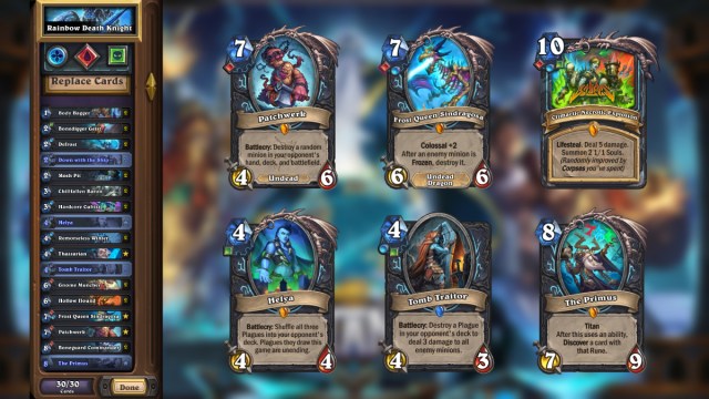 While the most popular flavors of Death Knight so far have been those that commit fully to a single Rune, usually Blood or Frost, support for a three-Rune build, known colloquially as ‘Rainbow Death Knight’, has been growing over the last few expansions. This build sacrifices raw power for flexibility, and gets to play all of the best single-Rune cards as a result, including Patchwerk and Thassarian.