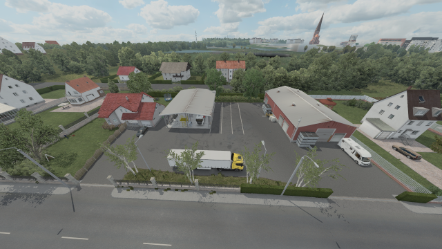 In contrast to the previous mod for ETS2, this one is a monstrous building made for the sleeping giants of the highway. Here, you can pull your truck into this multi-floored garage to work on it or take pictures. The huge, glass-fronted structure sits just off the highway and can house multiple trucks.