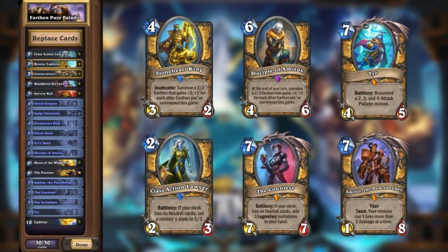 Of course, getting to the point in the game where you can resurrect your four and six-mana Minions with Tyr (a seven-mana Minion) or Tyr’s Tears (a five-to-seven mana spell) takes a while, so to help us get there we’ve blended the Earthen package with a classic Pure Paladin shell, featuring powerful survivability tools like Class Action Lawyer, Elitist Snob, and Lightray. These cards all receive powerful bonuses if you have no Neutral cards in your deck, so it’s all Paladin all the way in here.