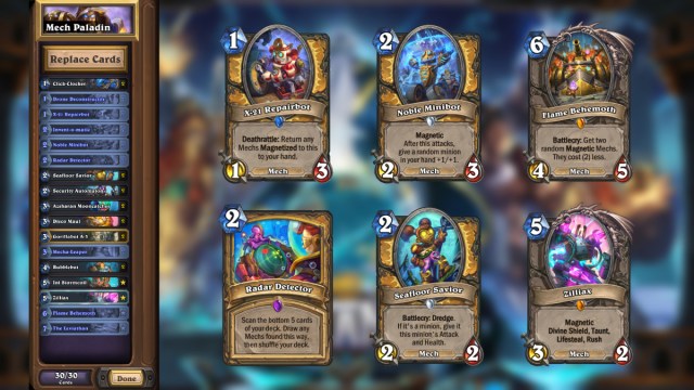 Beyond this stellar one-drop, Titans adds a lot of new aggressive tools for a Mech Paladin deck, including the previously-mentioned Drone Deconstructor, Noble Minibot, and Mecha-Leaper, all of which can perform well alone but work even better Magnetized onto an existing Mech. You can empty your hand fairly early with this deck, but Radar Detector is there to break your fall, serving as a two mana draw five in many cases, since the vast majority of your deck is made up of Mechs.
