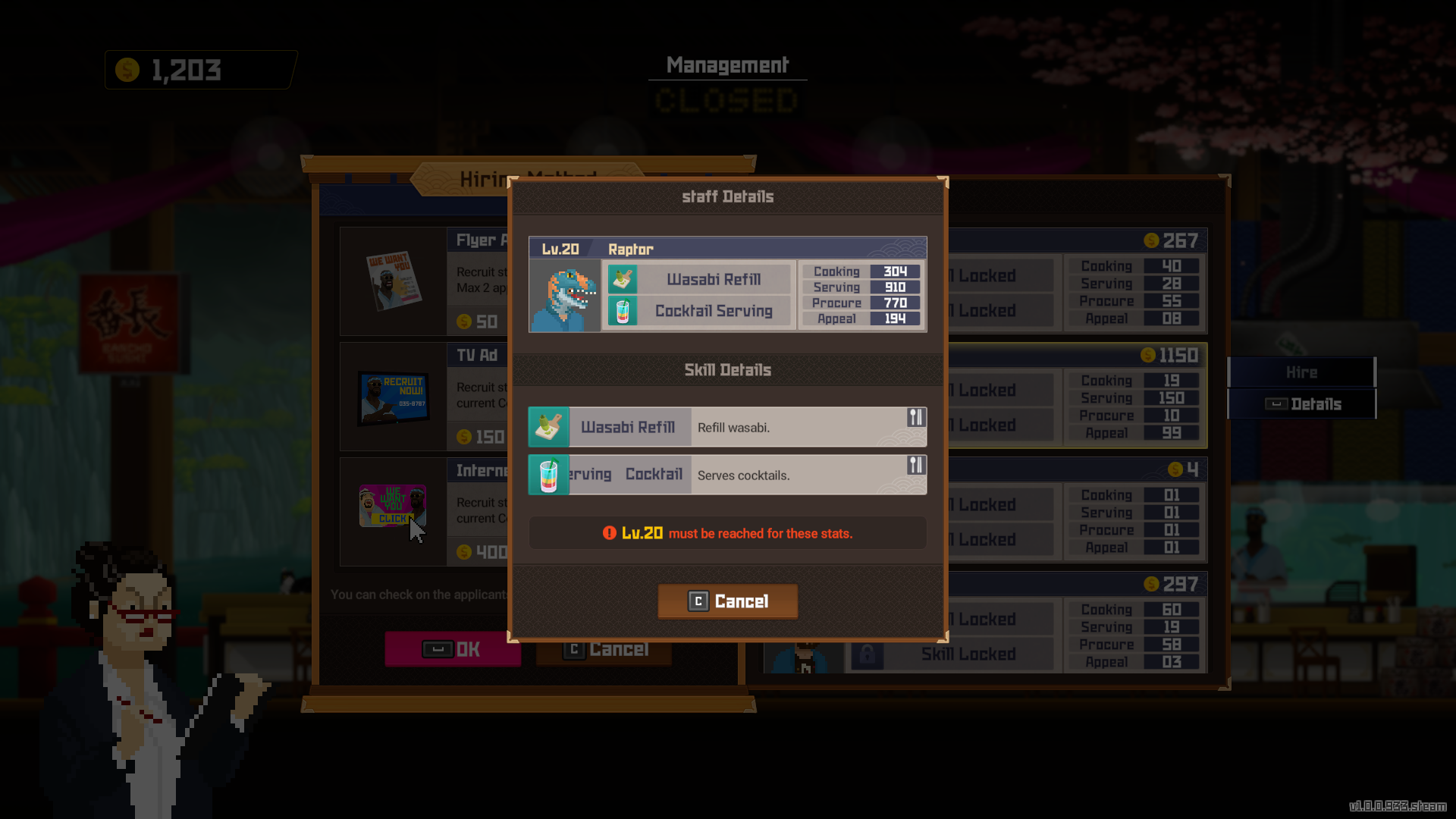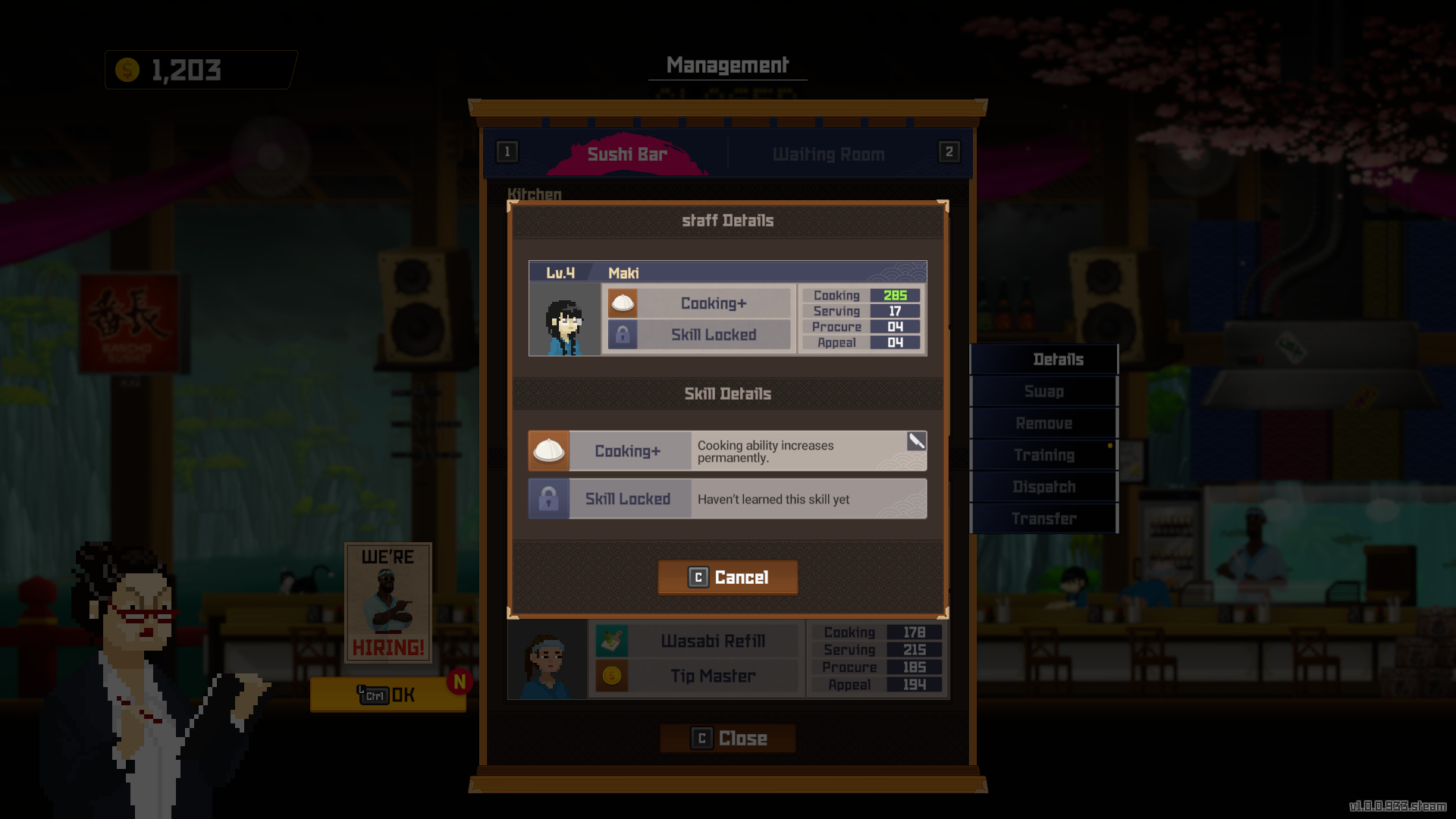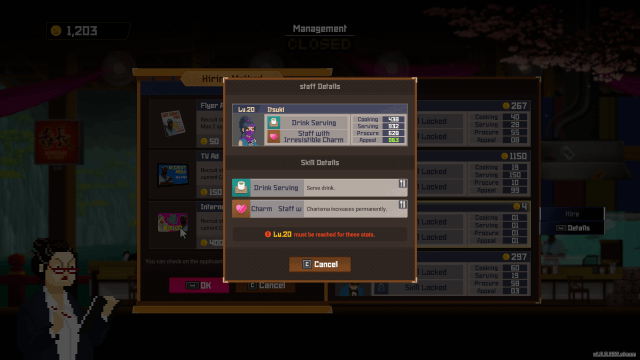 It is possible to hire Itsuki as a member of staff for almost nothing in Dave the Diver, but the money is more than worth it. She seems like a terrible choice at first, but as soon as you put her through staff training, she becomes a service superhero. Her drink serving and irresistible charm traits make her an absolute must-have on the floor. As you train her up, she really begins to outshine the other staff. Sometimes, the gamble plays off with Dave the Diver staff.