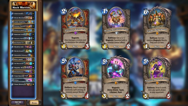 A bit of an offbeat option, Mech Warrior is a mostly-neutral Mech deck that makes use of Warrior’s powerful exclusive cards within the type, these being Furious Furnace and Dyn-o-matic. Both give you the ability to control the board effectively, making it more likely that you’ll keep a Mech around to Magnetize your other Mechs onto.
