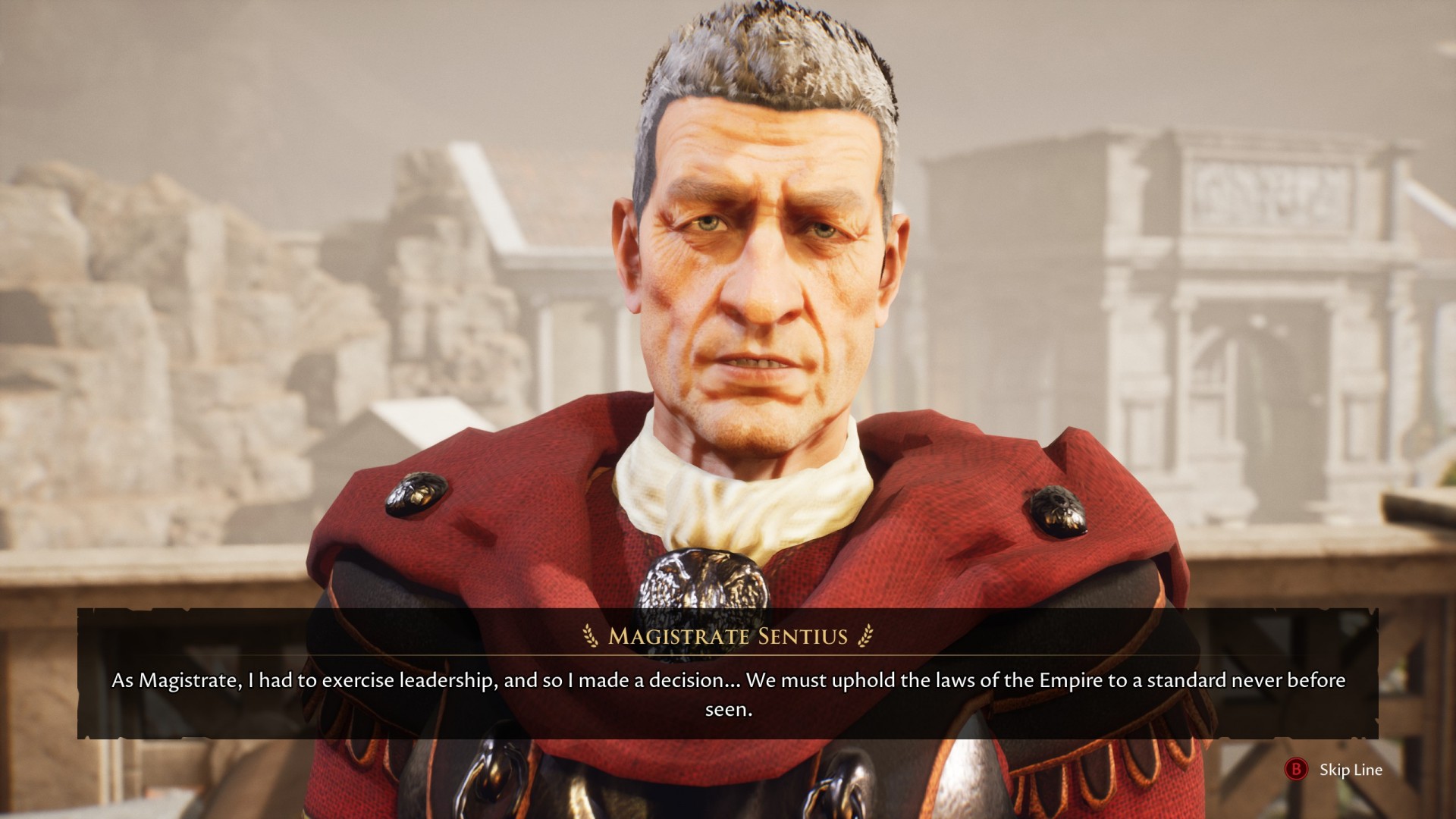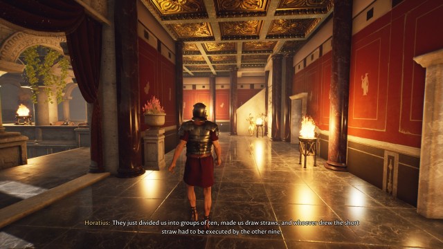 In a fairly major pivot, The Forgotten City takes place in our world and the portal leads to an underground city in Rome, albeit two thousand years ago. As such, each character has a different name and the level design received noticeable changes. Similarly, the dialogue is new and loaded with major differences. There’s a ton of new stuff in general. But, the basic gist is that this city follows a rule: if anyone sins, everyone in town will turn into a gold statue. You happened to see a bunch of gold statues on your way to the portal, so, yeah.