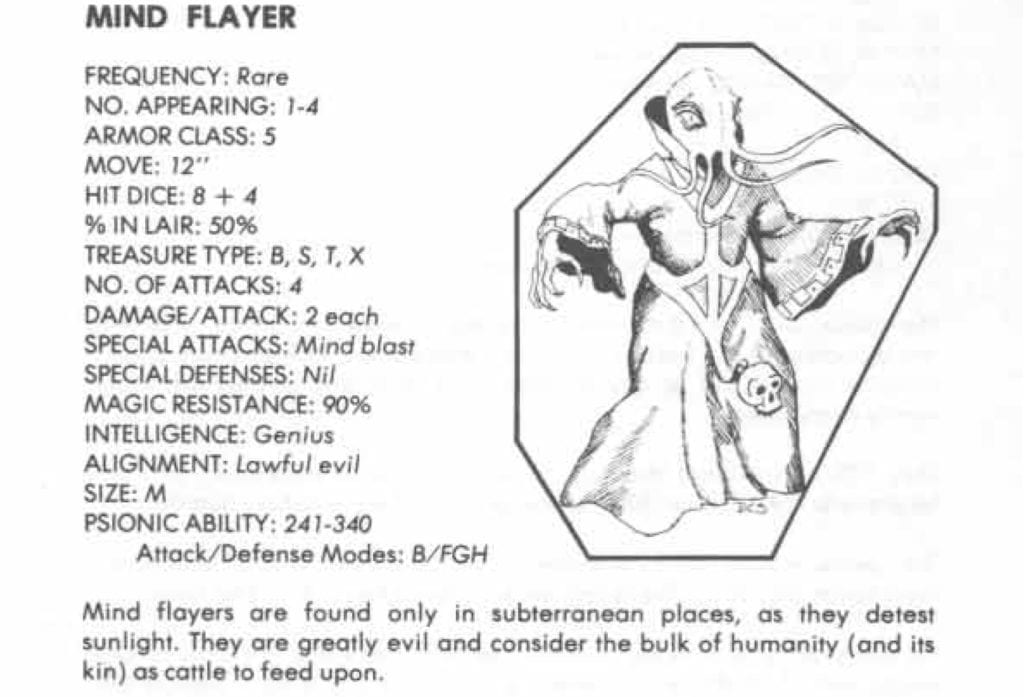 Dungeons & Dragons players will immediately recognize this nasty as a mind flayer, one of the game’s iconic monsters. Also known as illithids, the mind flayers have been around since the game’s early days, appearing in assorted periodicals with descriptions of psychic powers. But it was the first ever Monster Manual that codified the mind flayer’s distinctive appearance, with its high-collared, skull-adorned Ming the Merciless robe.