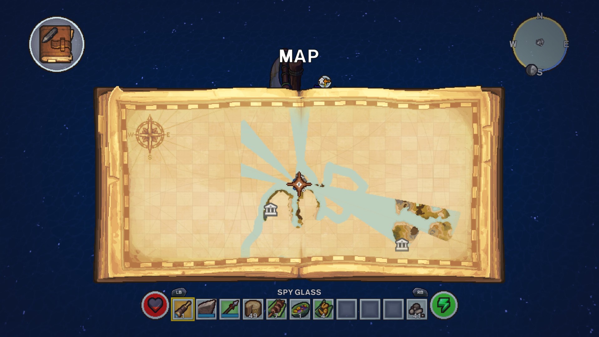 When the Spyglass is selected, hold the “use” button and move your cursor in any direction. As long as your view isn’t blocked, the horizon will be revealed on the map. It definitely helps so you know you’re not sailing off to the middle of nowhere. You could even use the Spyglass while you’re on your raft.
