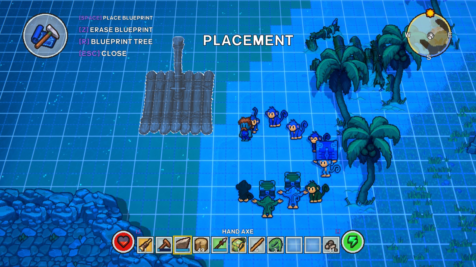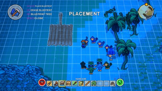 What’s that you ask? Oh, the raft. Yes, that’s what you need to build in The Survivalists so you can head to other landmasses and biomes. The raft is created via Blueprint Mode (6x wooden rod and 3x rope). You do need to be near the shoreline to place the raft’s blueprint. Likewise, you need the makeshift sail (3x fur clump, 3x palm leaf, and 3x rope). It’s created via the Crafting Bench.