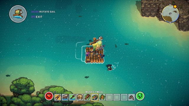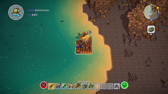 Anyway, place the makeshift sail on the raft and you’ve got yourself a boat. To control it, simply press “A” or “D” to rotate the sail. Press “F” to cancel “sailing mode” if you need to eat something, check the map, or use the Spyglass.