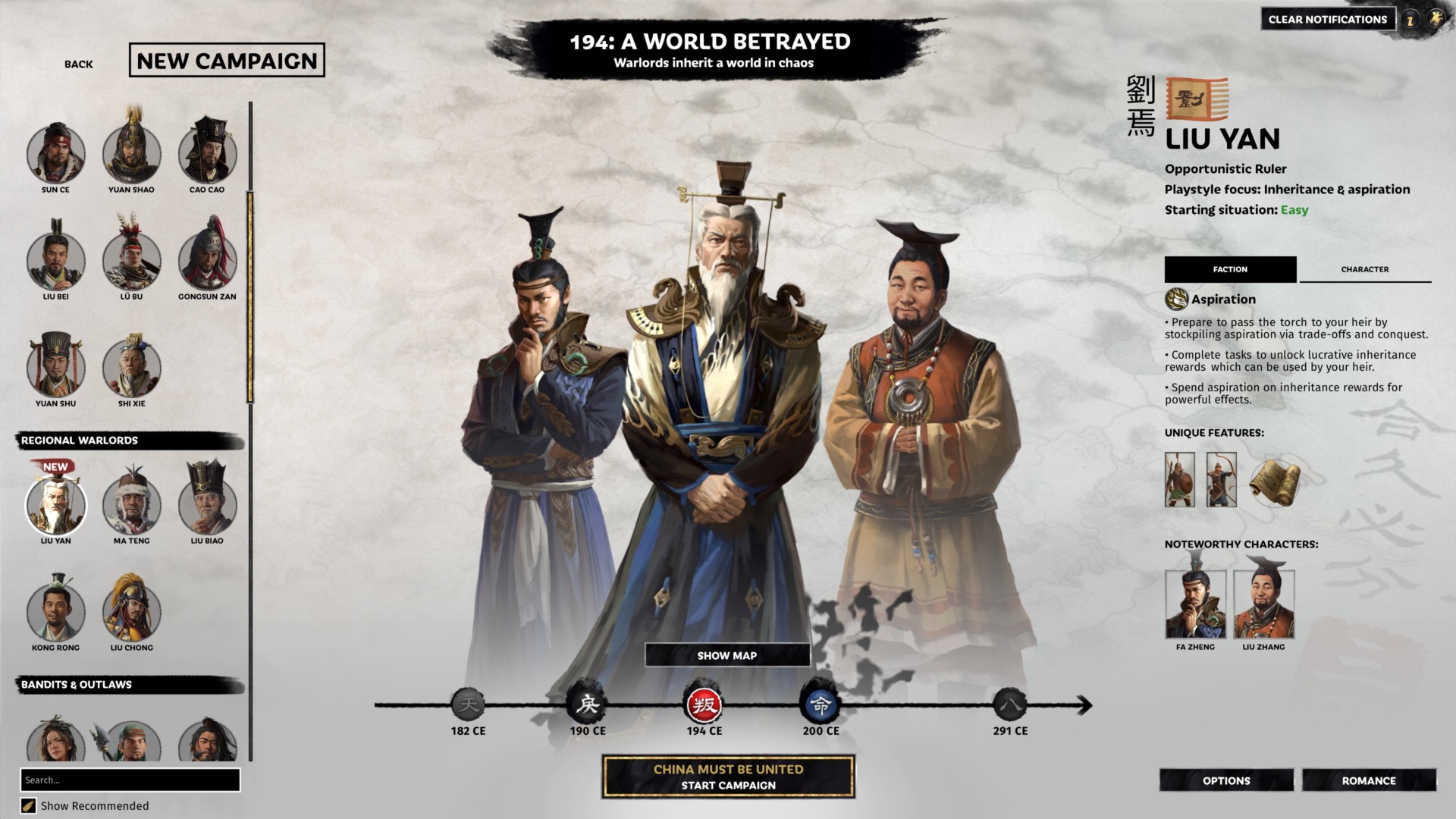 Note 1: Choosing a 200 CE campaign with Liu Zhang already leading the faction means that you’ll no longer be able to complete Aspiration tasks. You’re only left with Inheritance rewards as you continue to progress.
