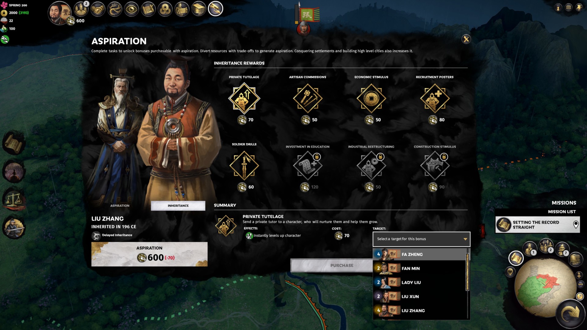 | Experienced General – Have your heir lead the army and complete 5 battles Note: Liu Yan starts his campaign leading his army (with Liu Zhang in support). Just swap to Liu Zhang as the leader while beating down enemies. | Industrial Restructuring – -35% recruitment costs (county); 10 turns | 70 points; 20-turn cooldown |