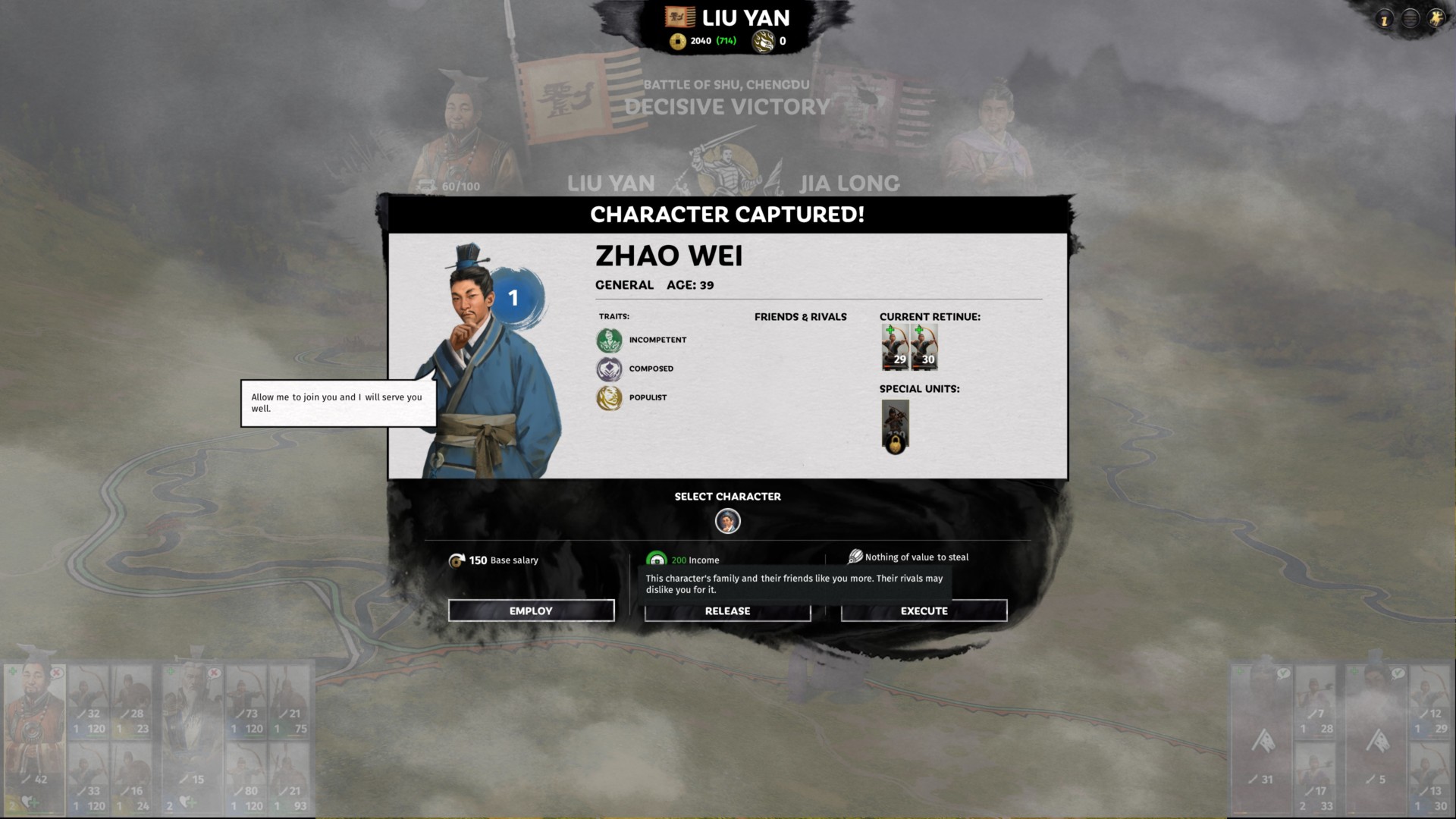 Regarding your military, make Liu Zhang the army leader and pounce on Jia Long. Try to capture a strategist named Zhao Wei since he has fire arrows and is close to unlocking +commerce/industry perks. Go conquer Jia Long’s city to complete a mission (+5,000 gold).