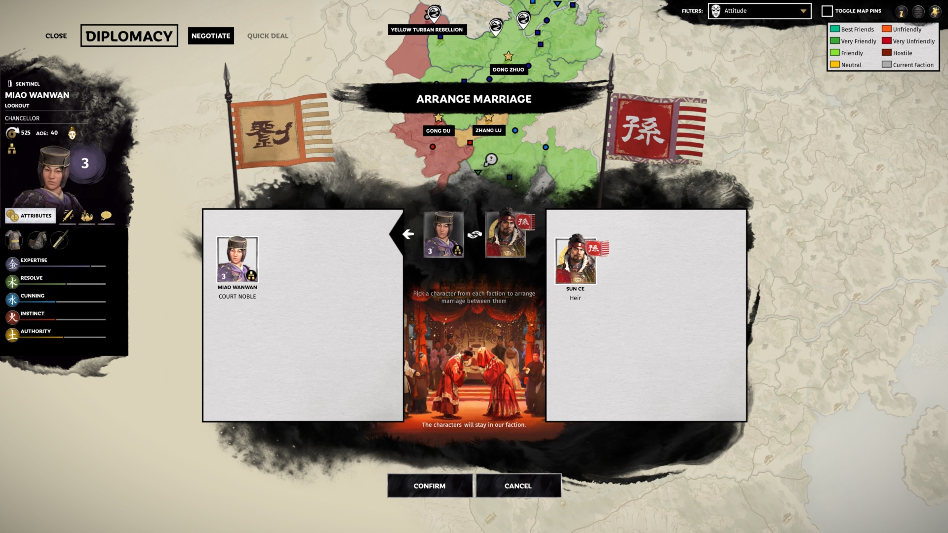 Dong Peishan (Dong Zhuo’s wife) will be the new faction leader. In that same turn, you’ll give her multiple gold-per-turn deals (at least 1 point in the diplomatic panel) to get the “favorable deals with us” relationship modifier. Continue doing this until relations are high enough, then give lump sums of gold (just 1 gold would do) several times until the relations “catch up.”